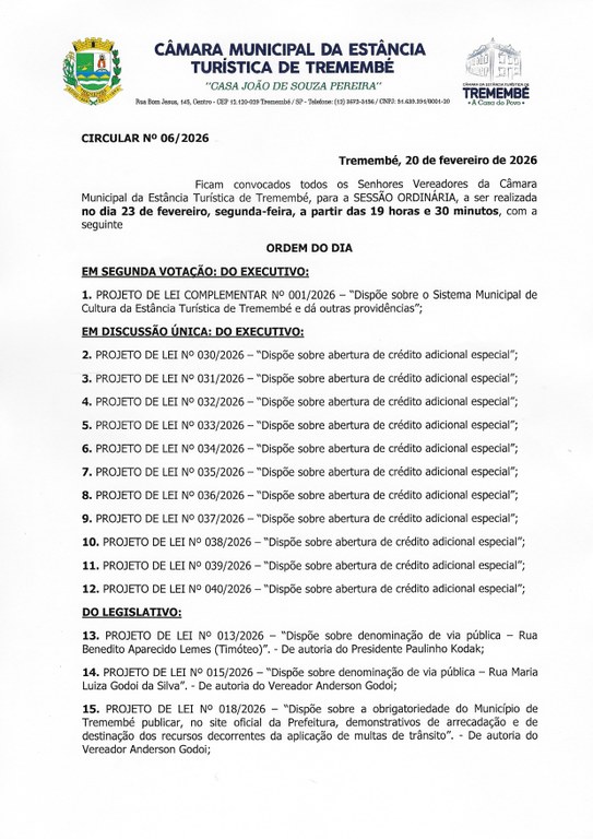 Ficam convocados todos os Senhores Vereadores da Câmara Municipal da Estância Turística de Tremembé, para a SESSÃO ORDINÁRIA, a ser realizada no dia 23 de fevereiro, segunda-feira, a partir das 19 horas e 30 minutos. Leia a Ordem do dia...