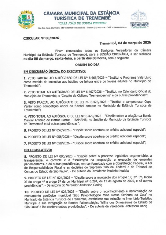 Ficam convocados todos os Senhores Vereadores da Câmara Municipal da Estância Turística de Tremembé, para a SESSÃO ORDINÁRIA, a ser realizada no dia 06 de março, sexta-feira, a partir das 08 horas. Leia a Ordem do dia...