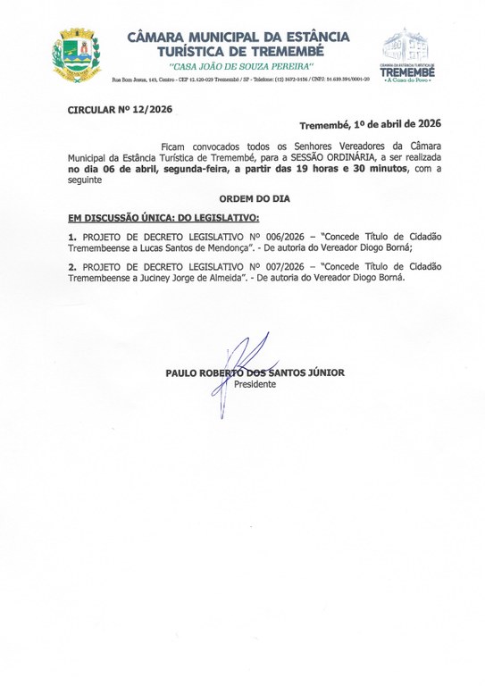 Ficam convocados todos os Senhores Vereadores da Câmara Municipal da Estância Turística de Tremembé, para a SESSÃO ORDINÁRIA, a ser realizada no dia 06 de abril, segunda-feira, a partir das 19 horas e 30 minutos. Leia a Ordem do dia...