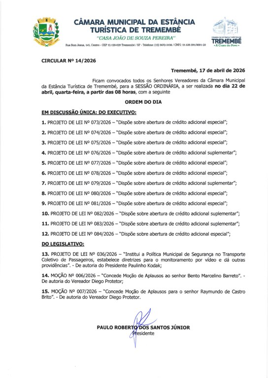 Ficam convocados todos os Senhores Vereadores da Câmara Municipal da Estância Turística de Tremembé, para a SESSÃO ORDINÁRIA, a ser realizada no dia 22 de abril, quarta-feira, a partir das 08 horas. Leia a Ordem do dia...