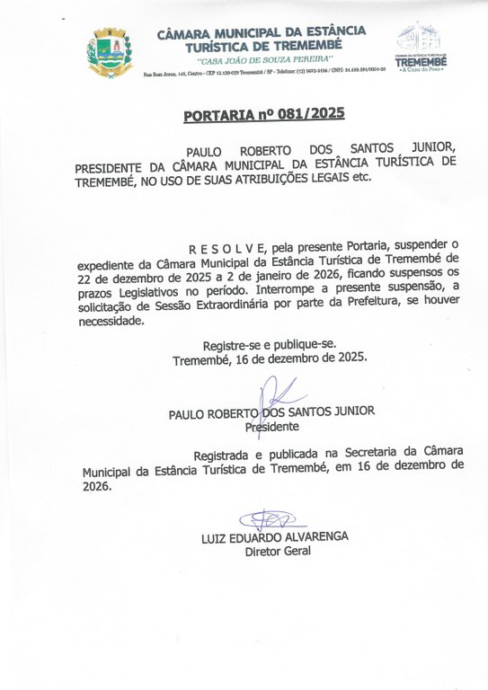 PORTARIA N° 081-2025 que dispõe sobre a suspensão do expediente da Câmara Municipal de Tremembé de 22 de dezembro de 2025 a 02 de janeiro de 2026, na forma que especifica...