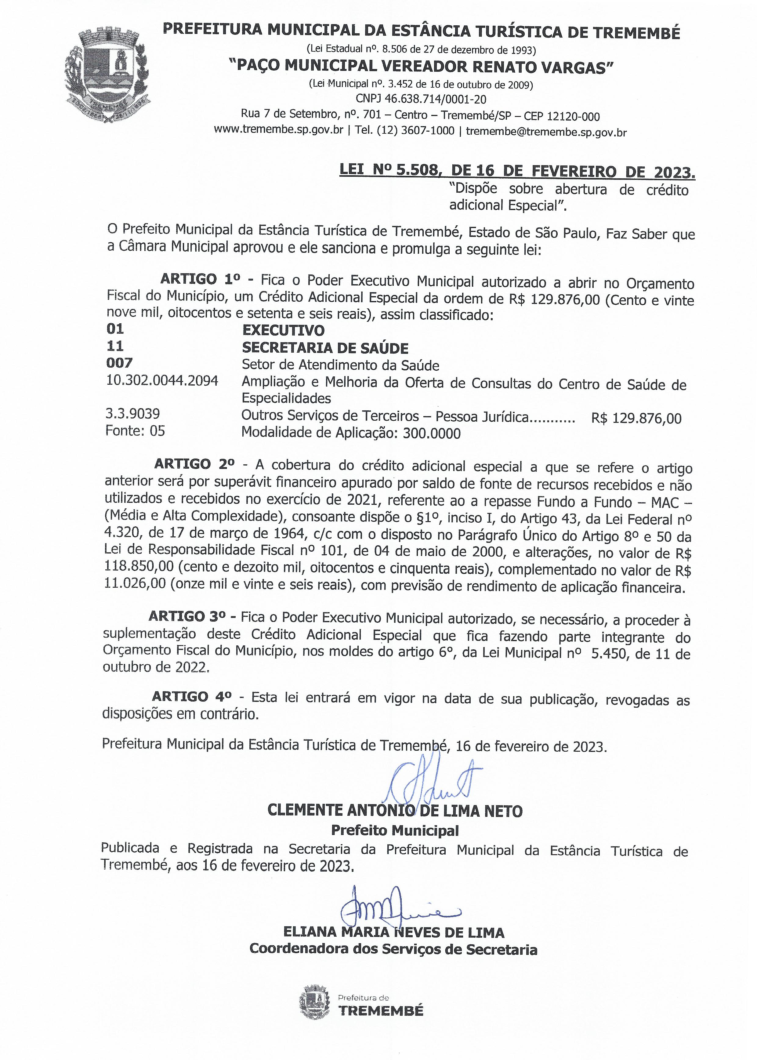Lei nº 5.508, de 16 de fevereiro de 2023