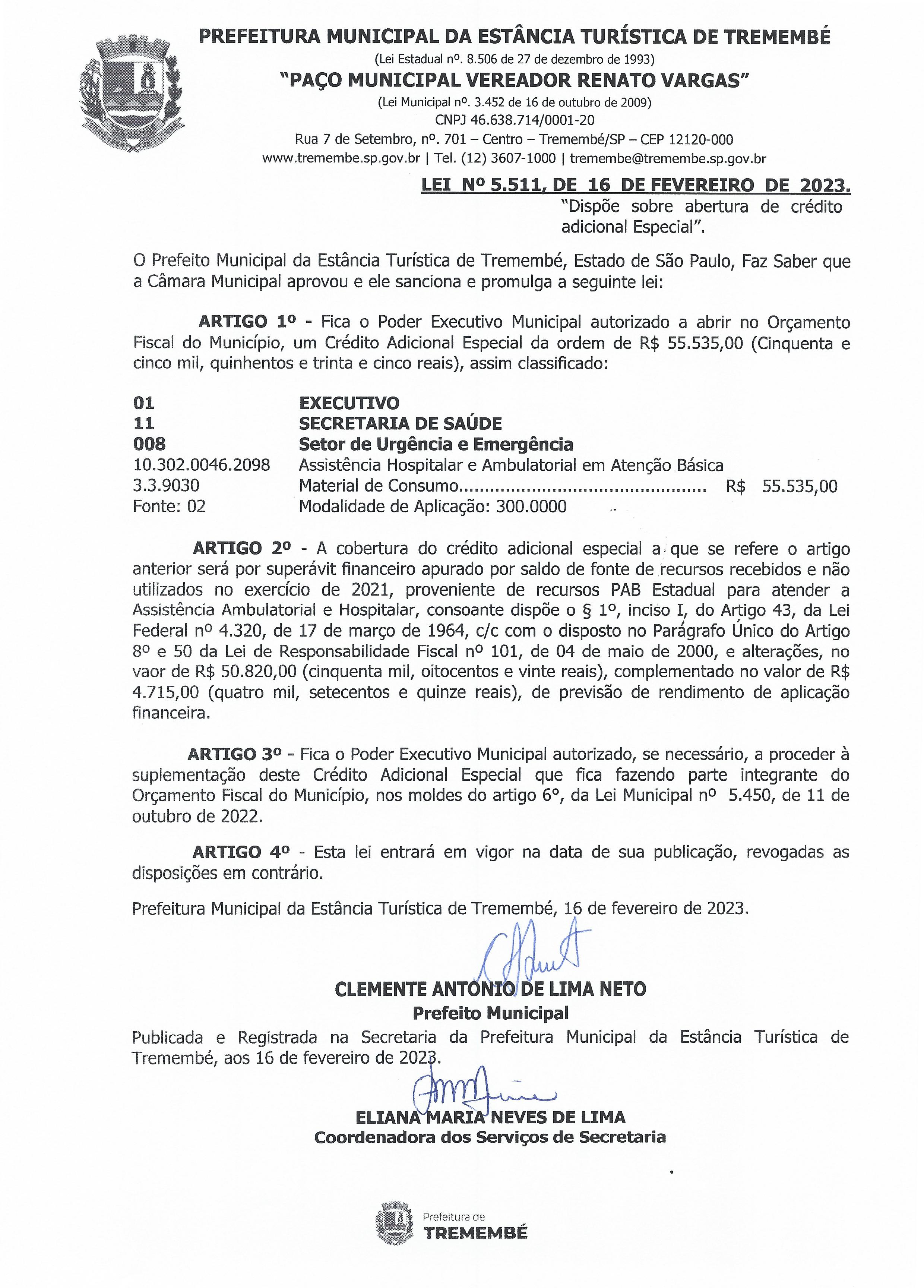 Lei nº 5.511, de 16 de fevereiro de 2023