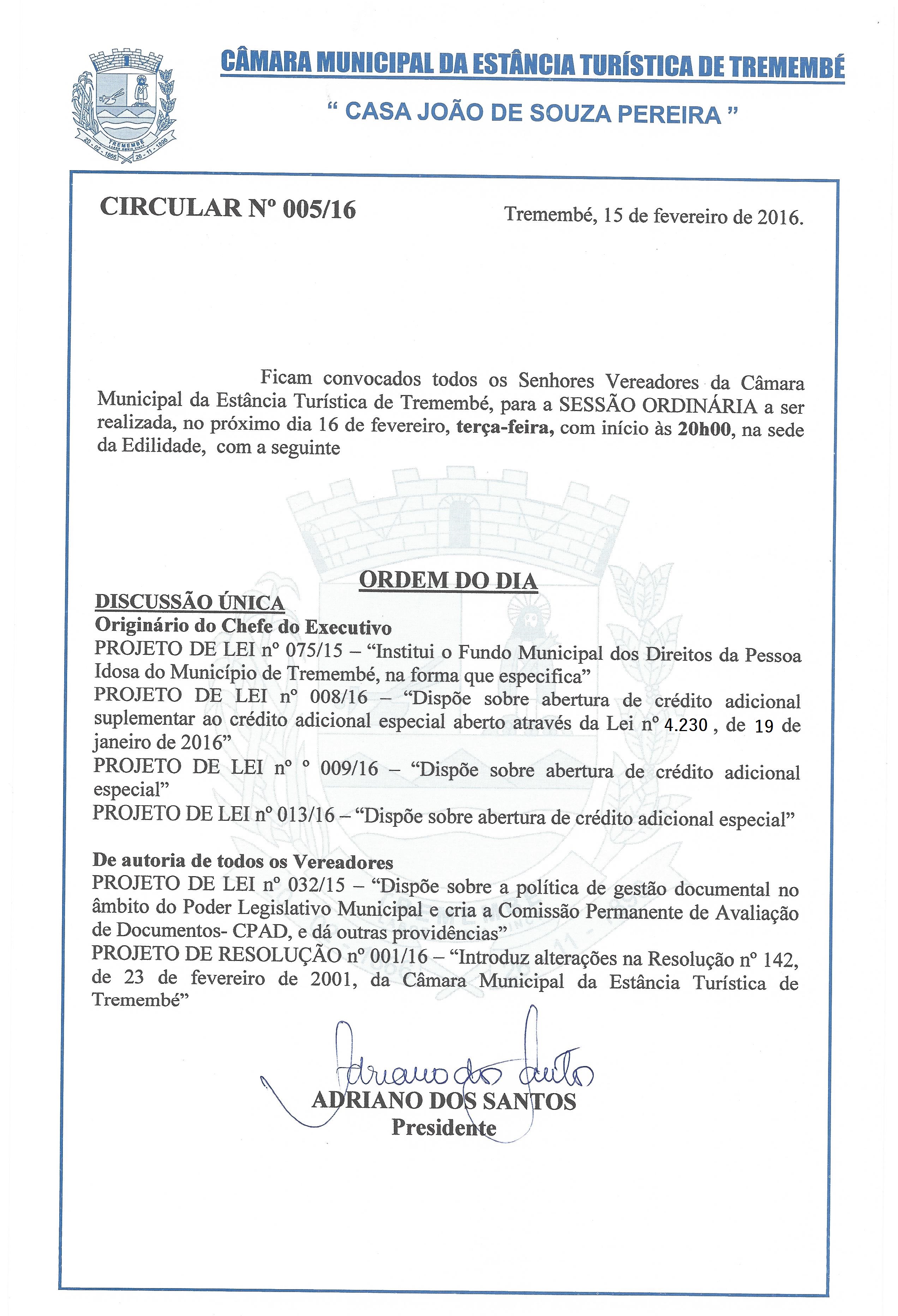 Circular N.º 05-2016 - Ordem do Dia - Sessão Ordinária - 16-02-2016