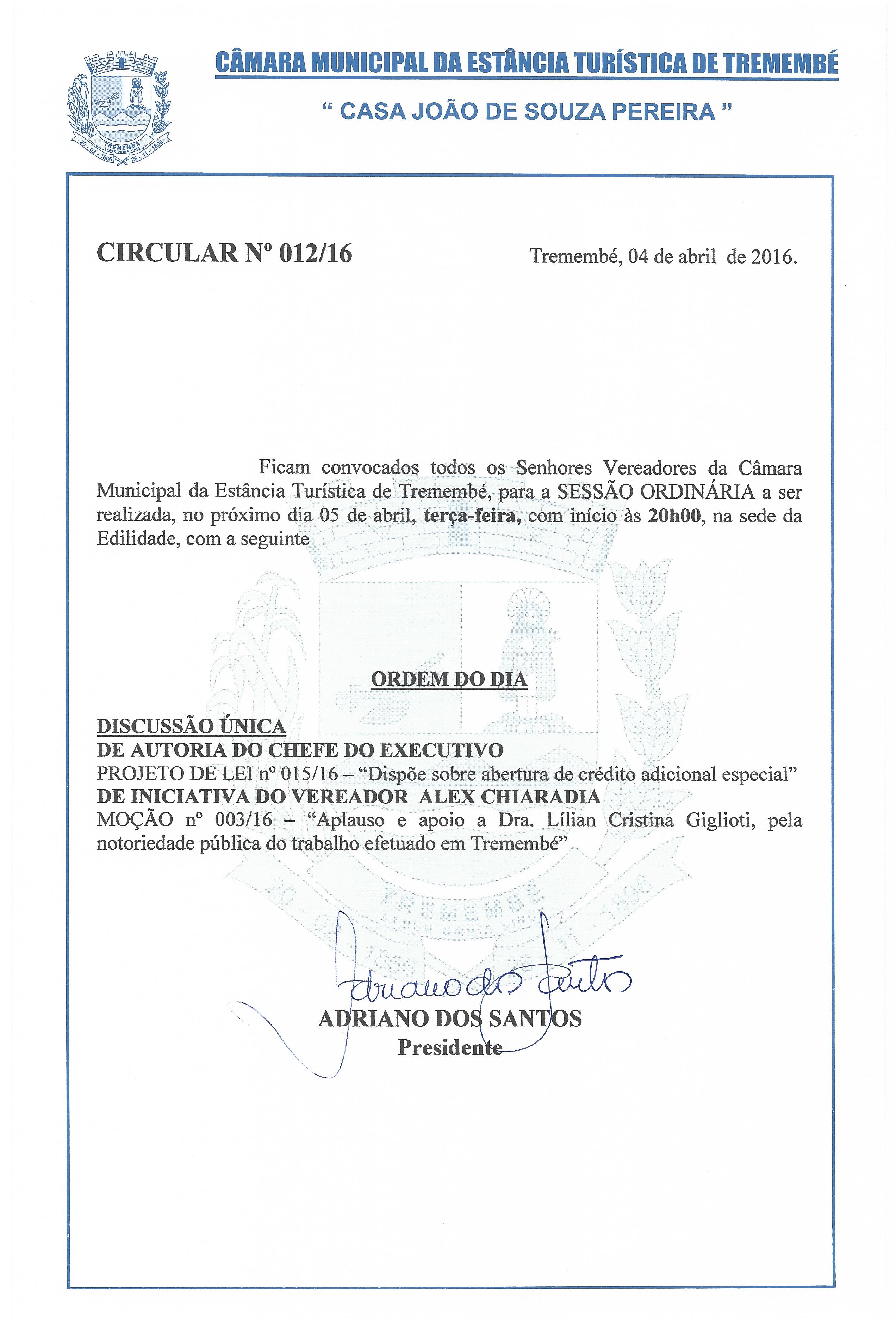 Circular N.º 12-2016 - Ordem do Dia - Sessão Ordinária - 05-04-2016