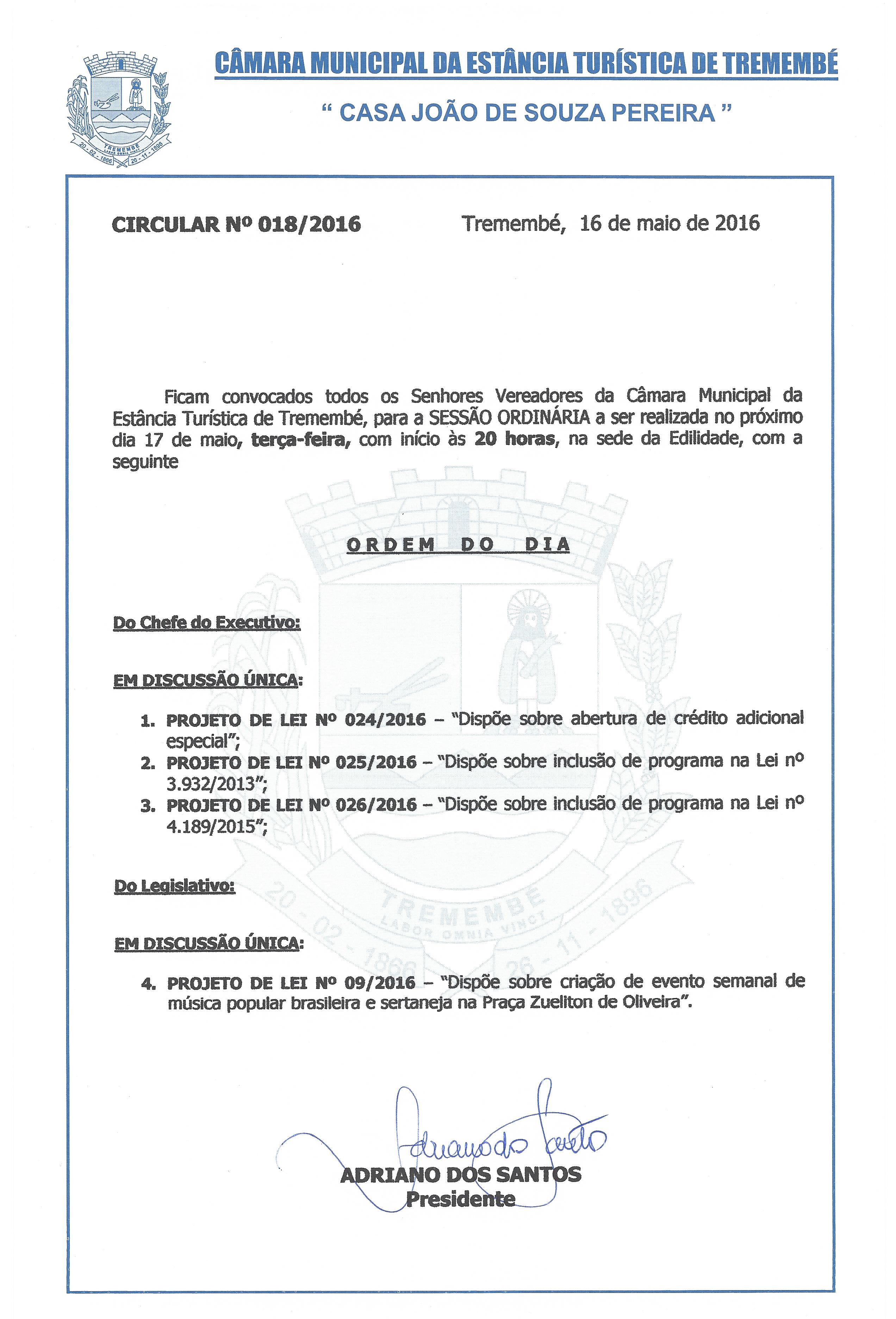 Circular N.º 18-2016 - Ordem do Dia - Sessão Ordinária - 17-05-2016