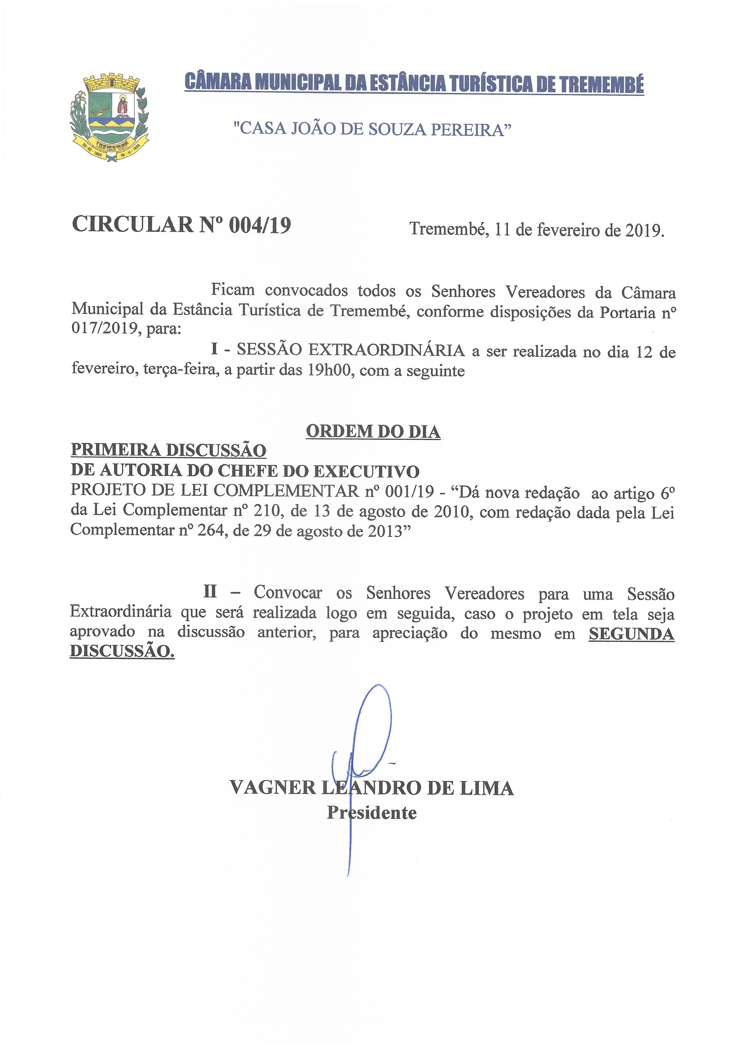 Pauta da Sessão Extraordinária - 12-02-2019