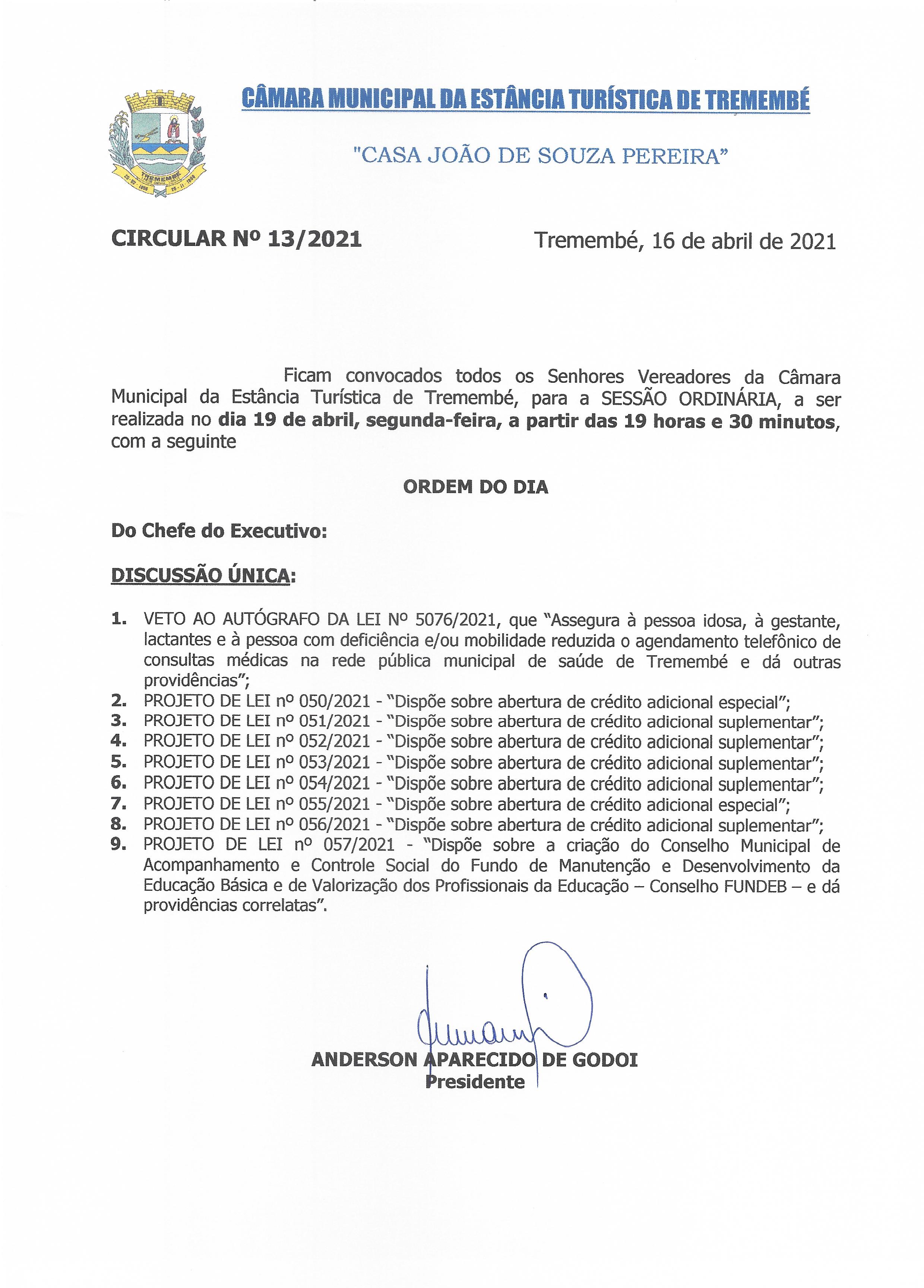 Pauta da 12° Sessão Ordinária - 19-04-2021