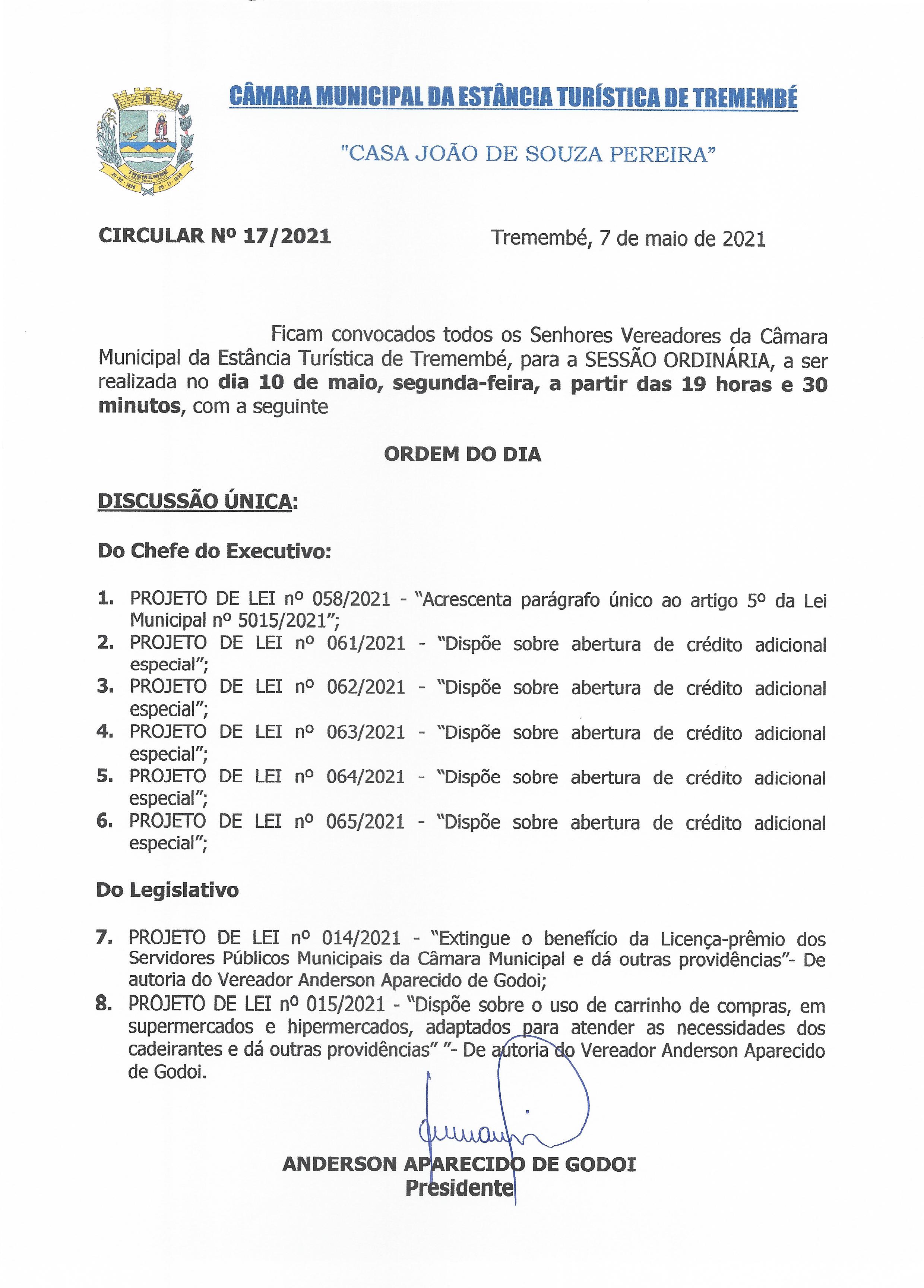 Pauta da 15ª Sessão Ordinária - 10-05-2021