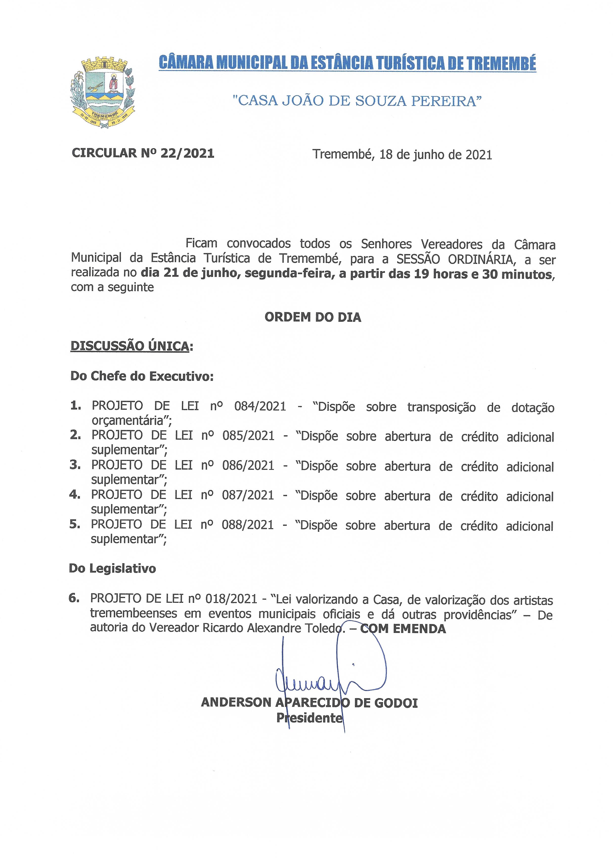 Pauta da 20ª Sessão Ordinária - 21-06-2021