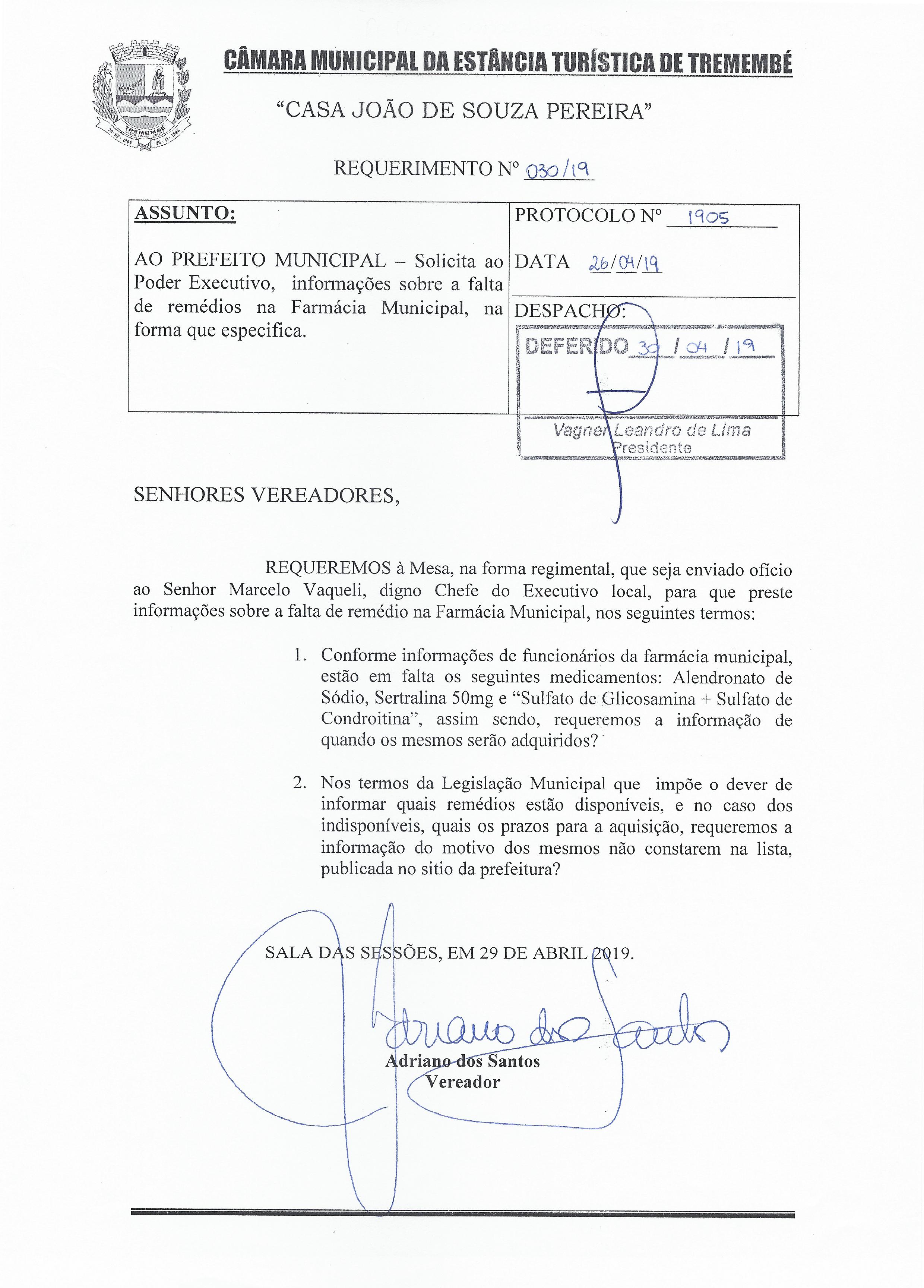 Requerimento n° 030-2019 - Adriano dos Santos