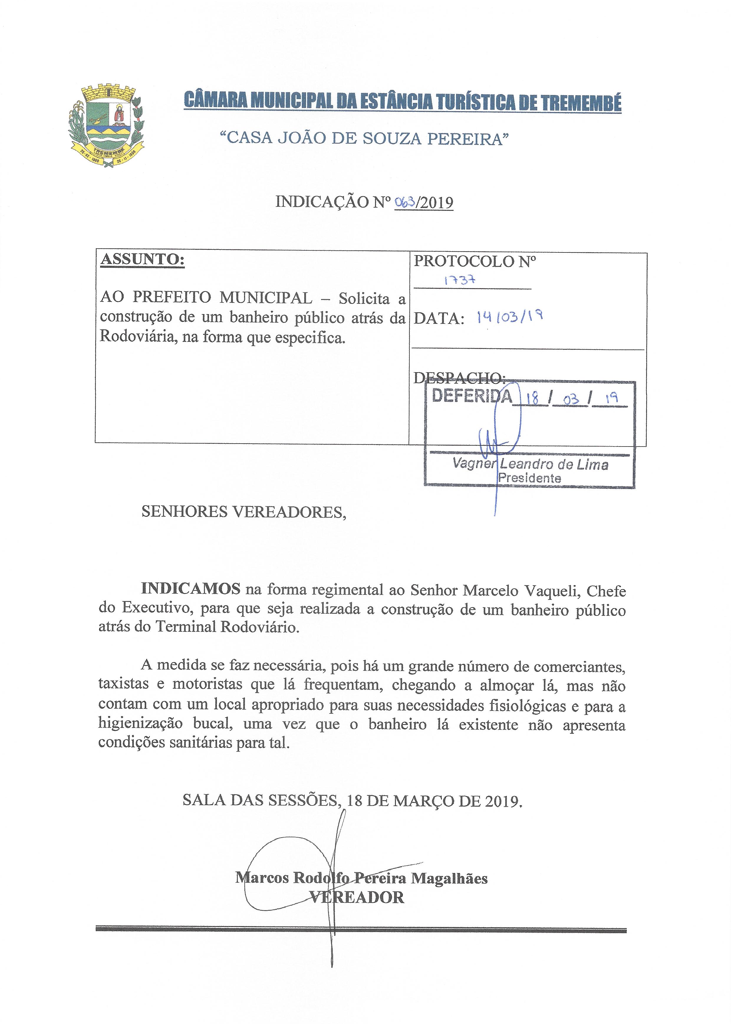 Indicação nº 063/2019 - De autoria do vereador Marcos Rodolfo Pereira Magalhães que solicita a construção de um banheiro público atrás da Rodoviária, na forma que especifica. – DEFERIDA –