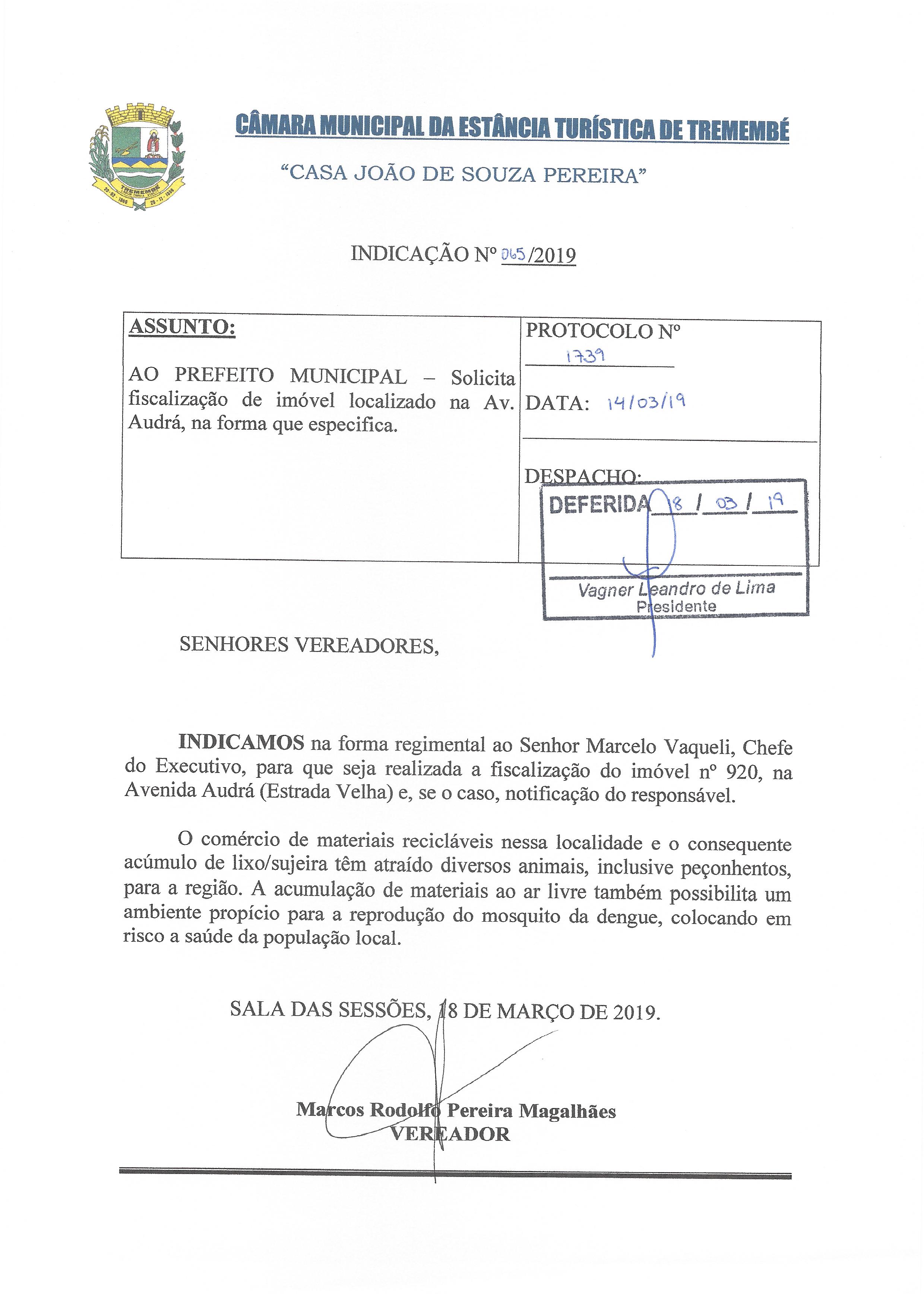 Indicação nº 065/2019 - De autoria do vereador Marcos Rodolfo Pereira Magalhães que solicita a fiscalização de imóvel localizado na Av. Audrá, na forma que especifica. – DEFERIDA –