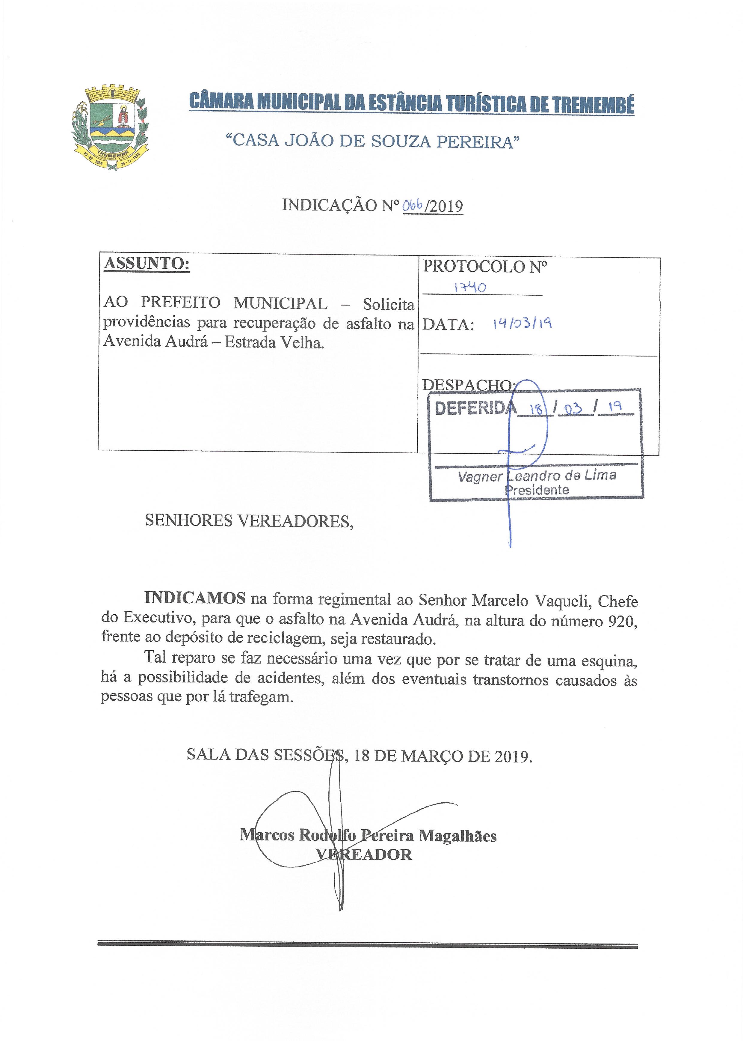 Indicação nº 066/2019 - De autoria do vereador Marcos Rodolfo Pereira Magalhães que solicita providências para recuperação de asfalto na Avenida Audrá – Estrada Velha. – DEFERIDA –