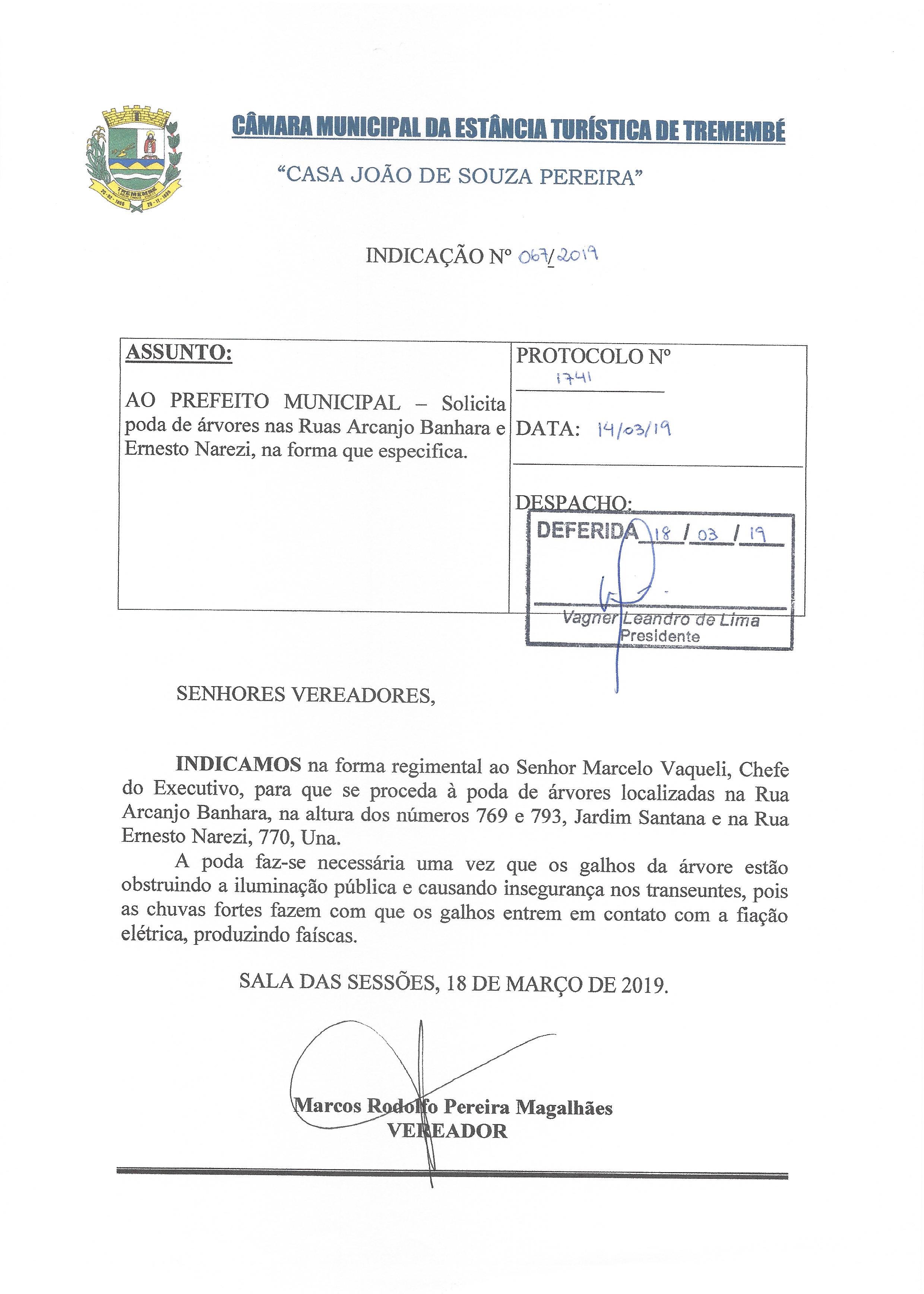 Indicação nº 067/2019 - De autoria do vereador Marcos Rodolfo Pereira Magalhães que solicita a poda de árvores nas Ruas Arcanjo Banhara e Ernesto Narezi, na forma que especifica – DEFERIDA –