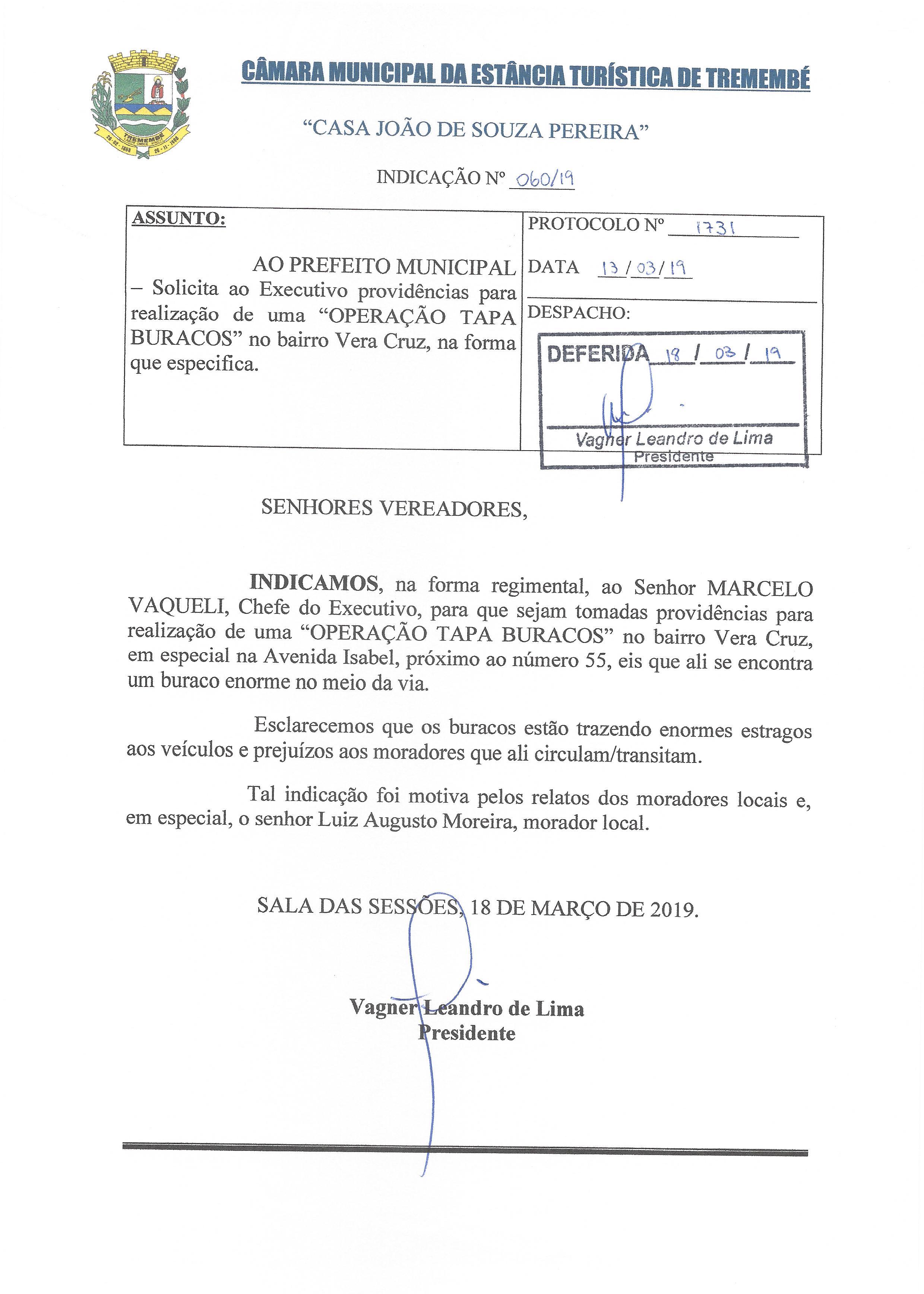 Indicação nº 060/2019 – De autoria do vereador Vagner Leandro de Lima que solicita a realização de uma “Operação Tapa Buracos” no bairro Vera Cruza, na forma que especifica. – DEFERIDA –