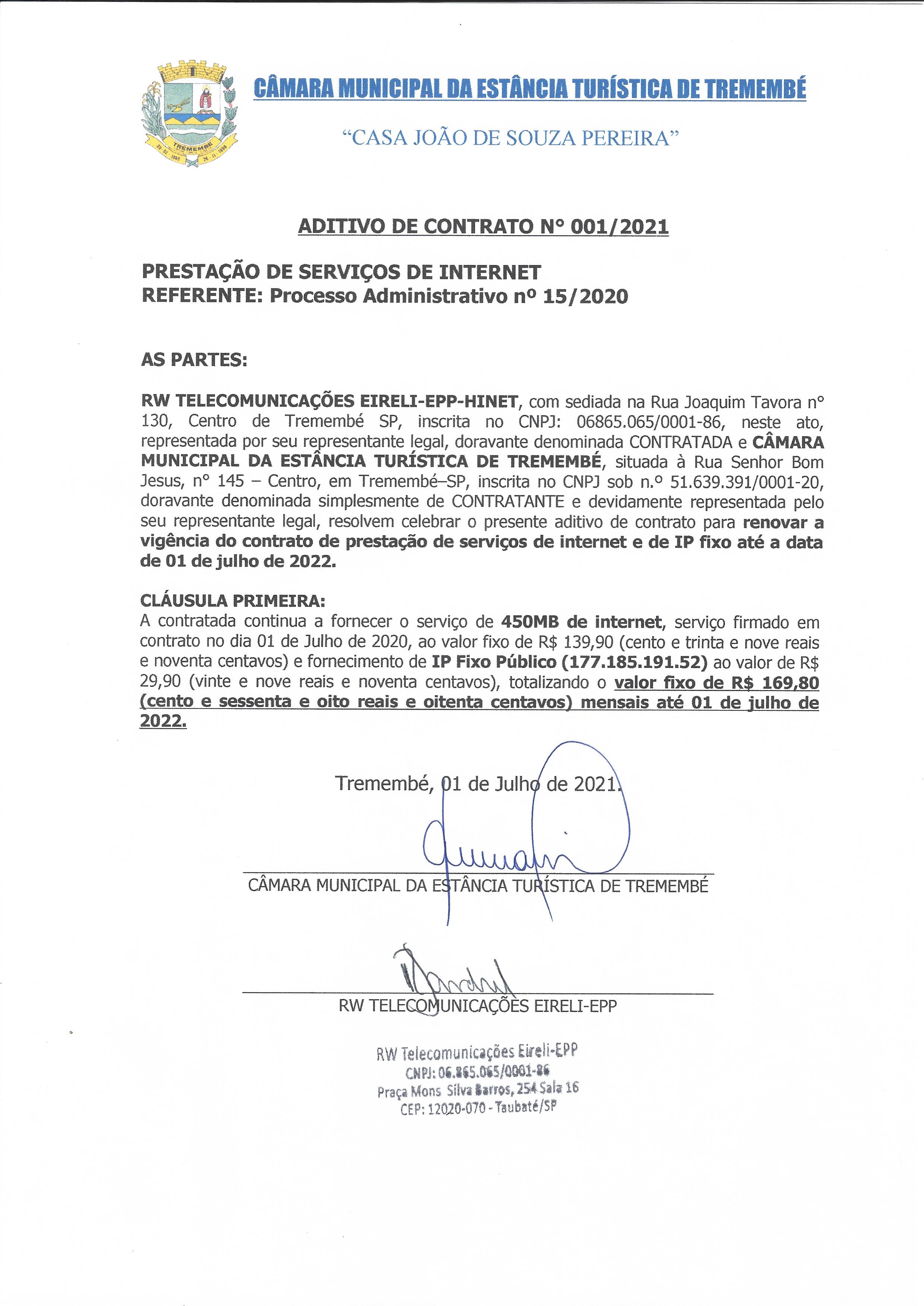 Aditivo de contrato de prestação de serviços de internet nº 001/2021 referente ao Processo Administrativo nº 15/2020.