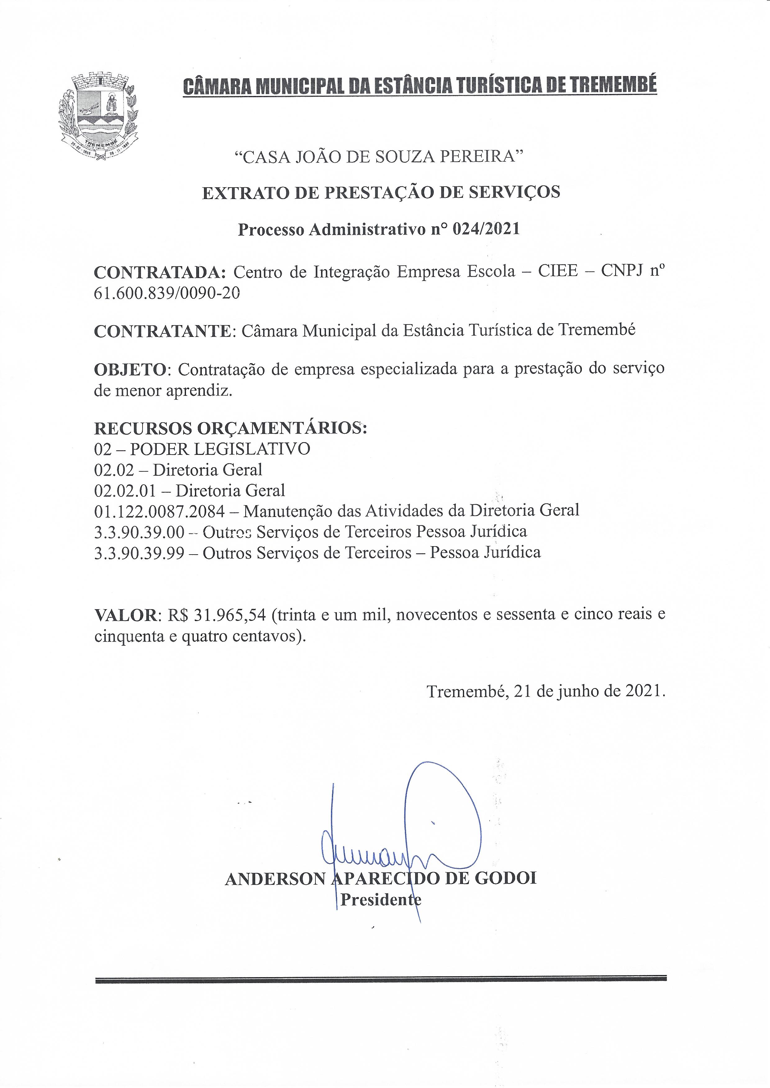 Extrato Contrato Prestação de Serviços - Menor Aprendiz - Contrato nº 024/2021