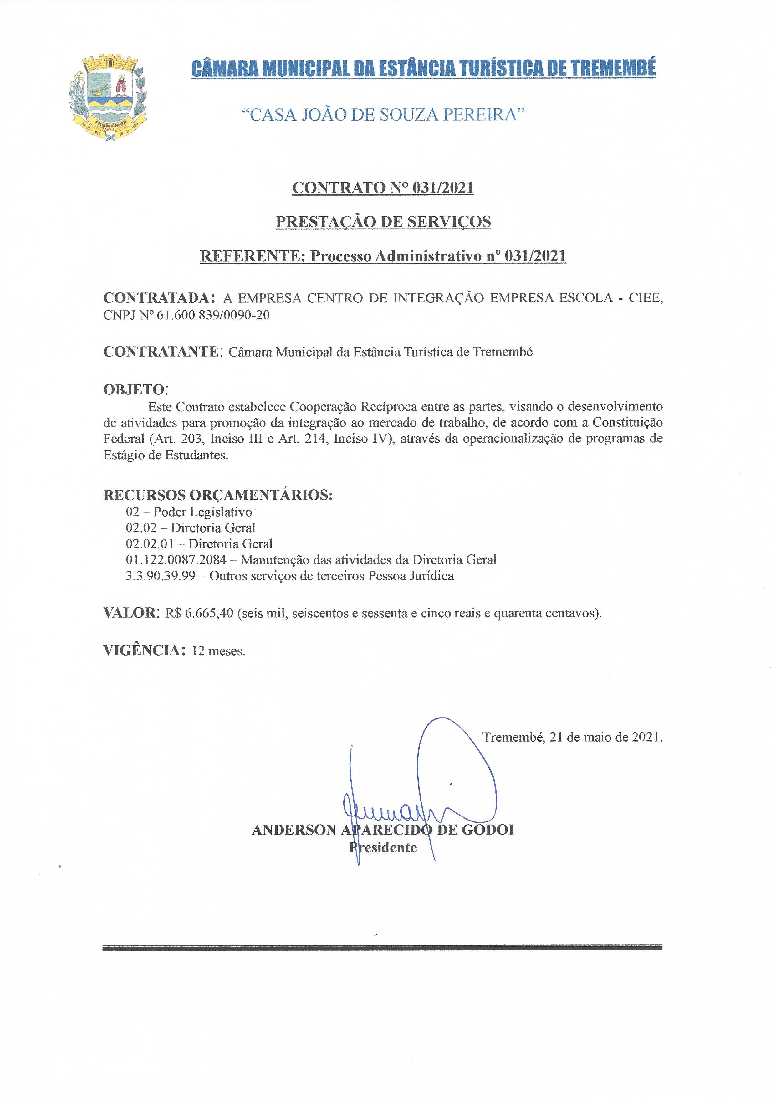 Extrato de Prestação de Serviços - CIEE - Processo Administrativo nº 031/2021