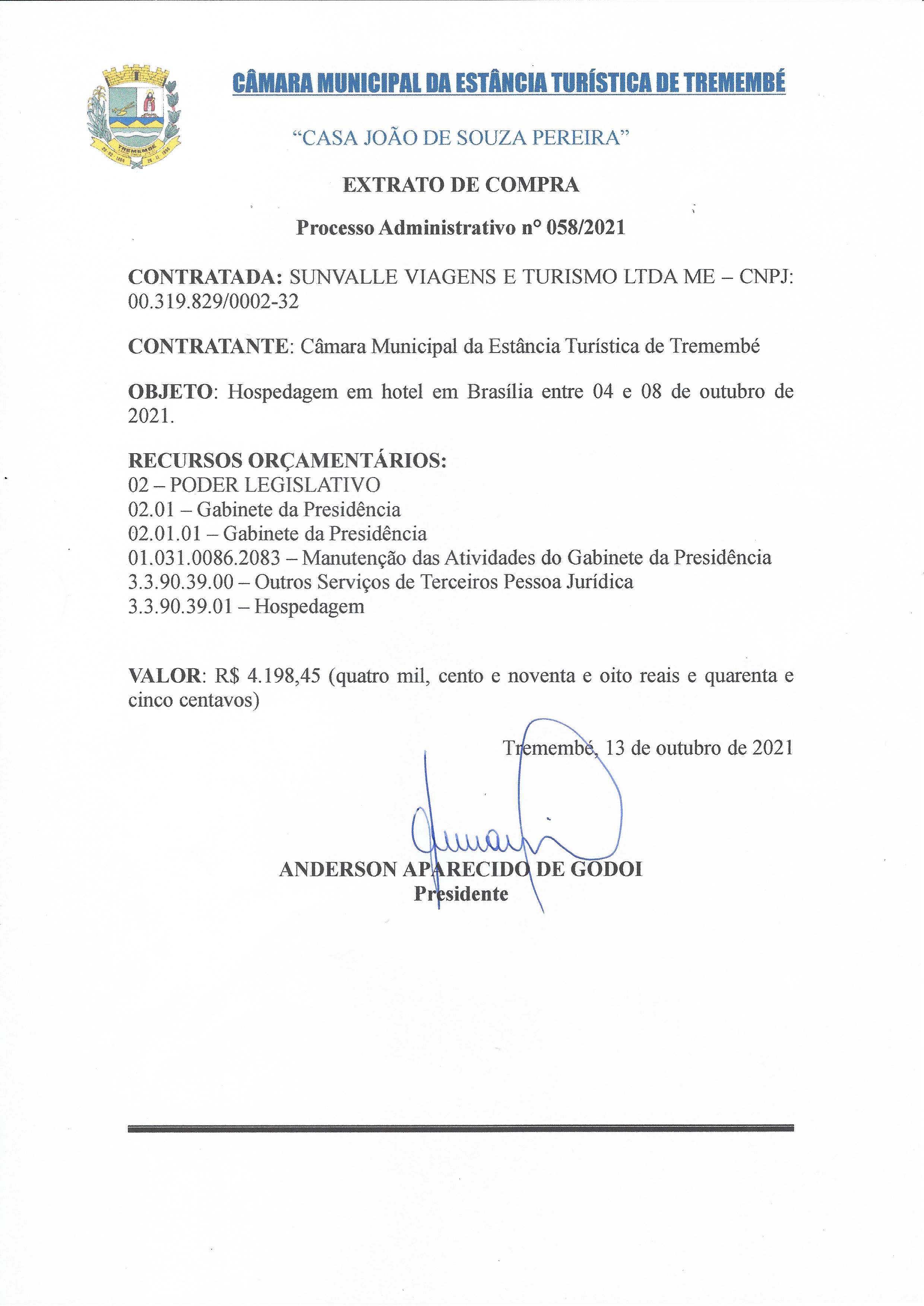 Extrato - Dispensa de Licitação - Hospedagem - Ref. Proc. nº 058/2021