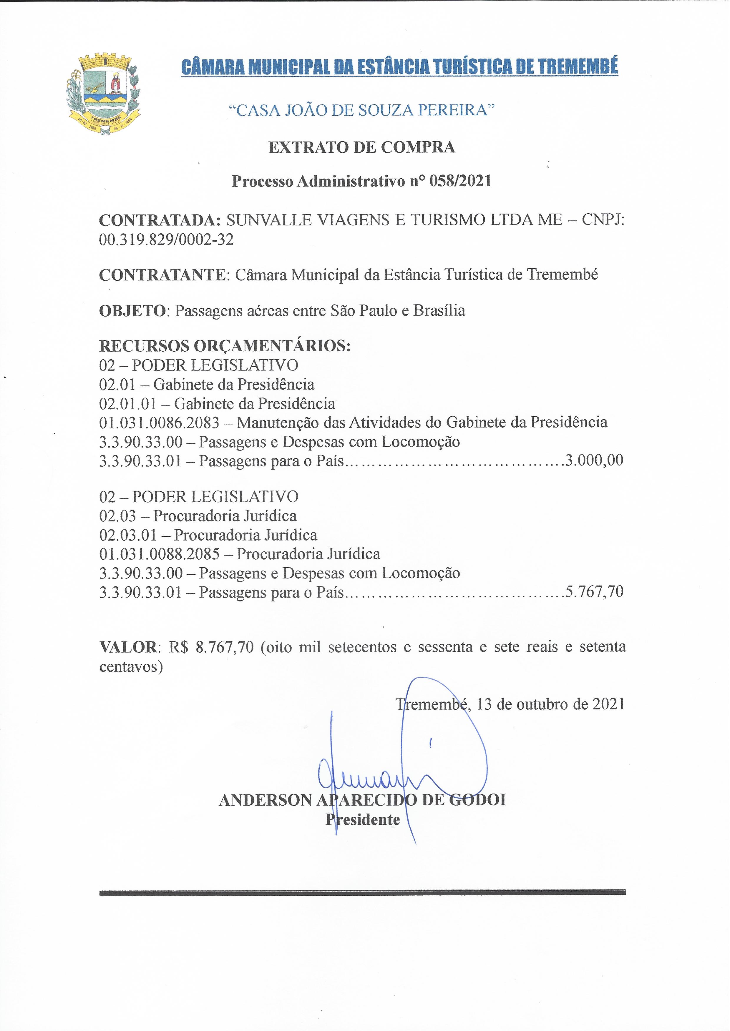 Extrato - Dispensa de Licitação - Passagens Aéreas - Ref. Proc. nº 058/2021