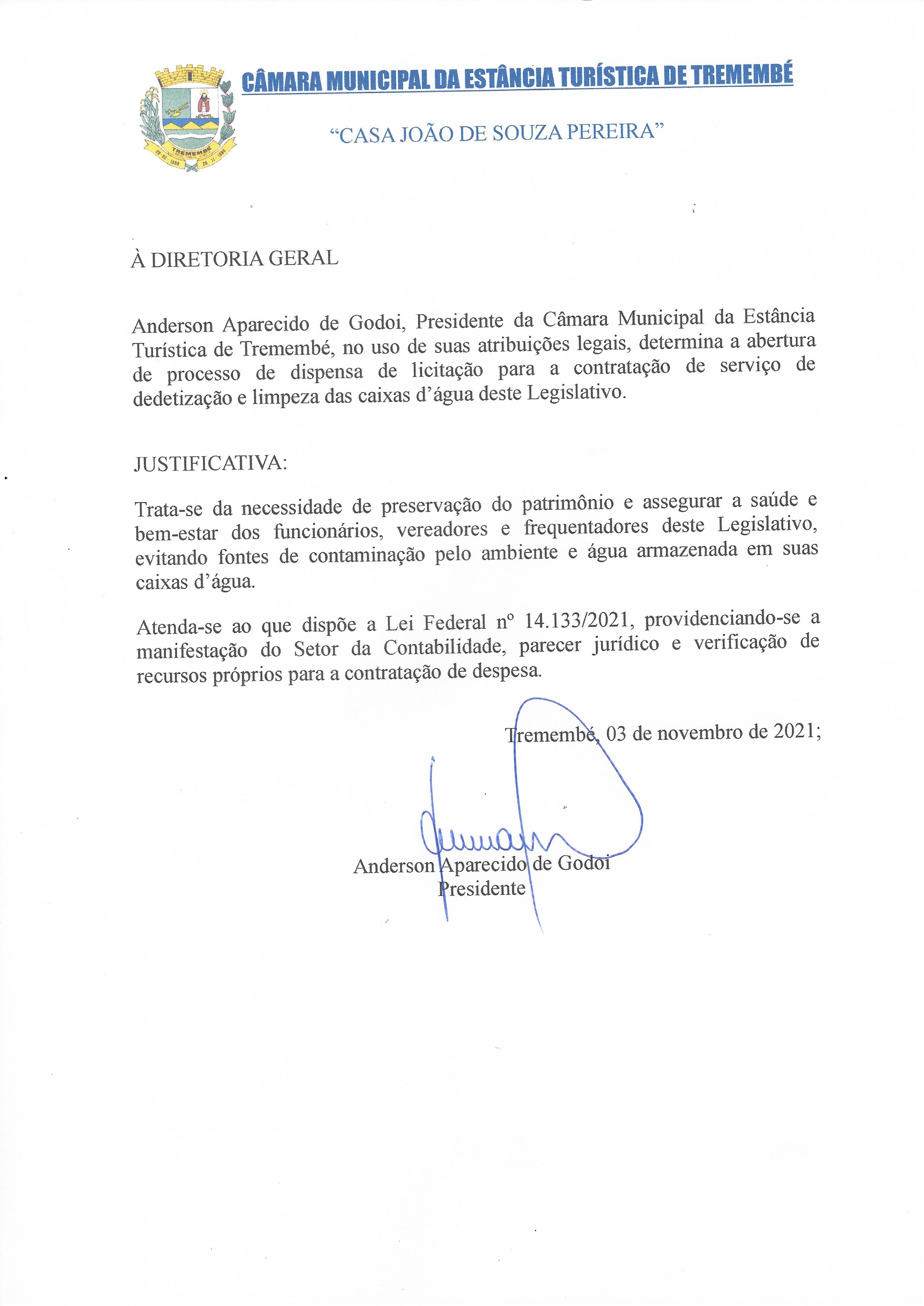 Processo de dispensa de licitação para realização de serviço de dedetização e limpeza de caixas d'água deste Legislativo.