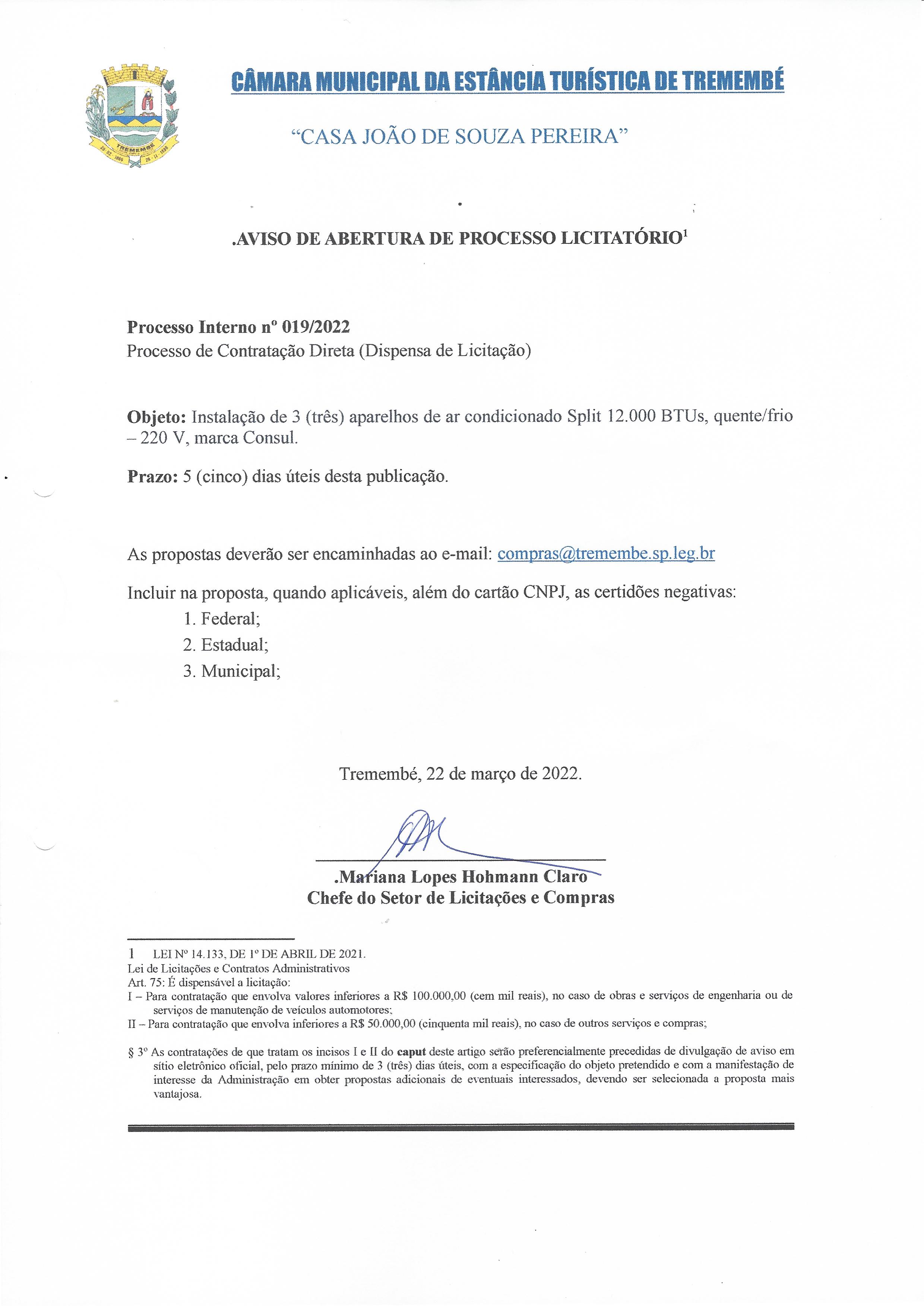 Proc. nº 019/22 - AVISO DE ABERTURA DE PROCESSO LICITATÓRIO (Art. 75, §3º da Lei 14.133-21)