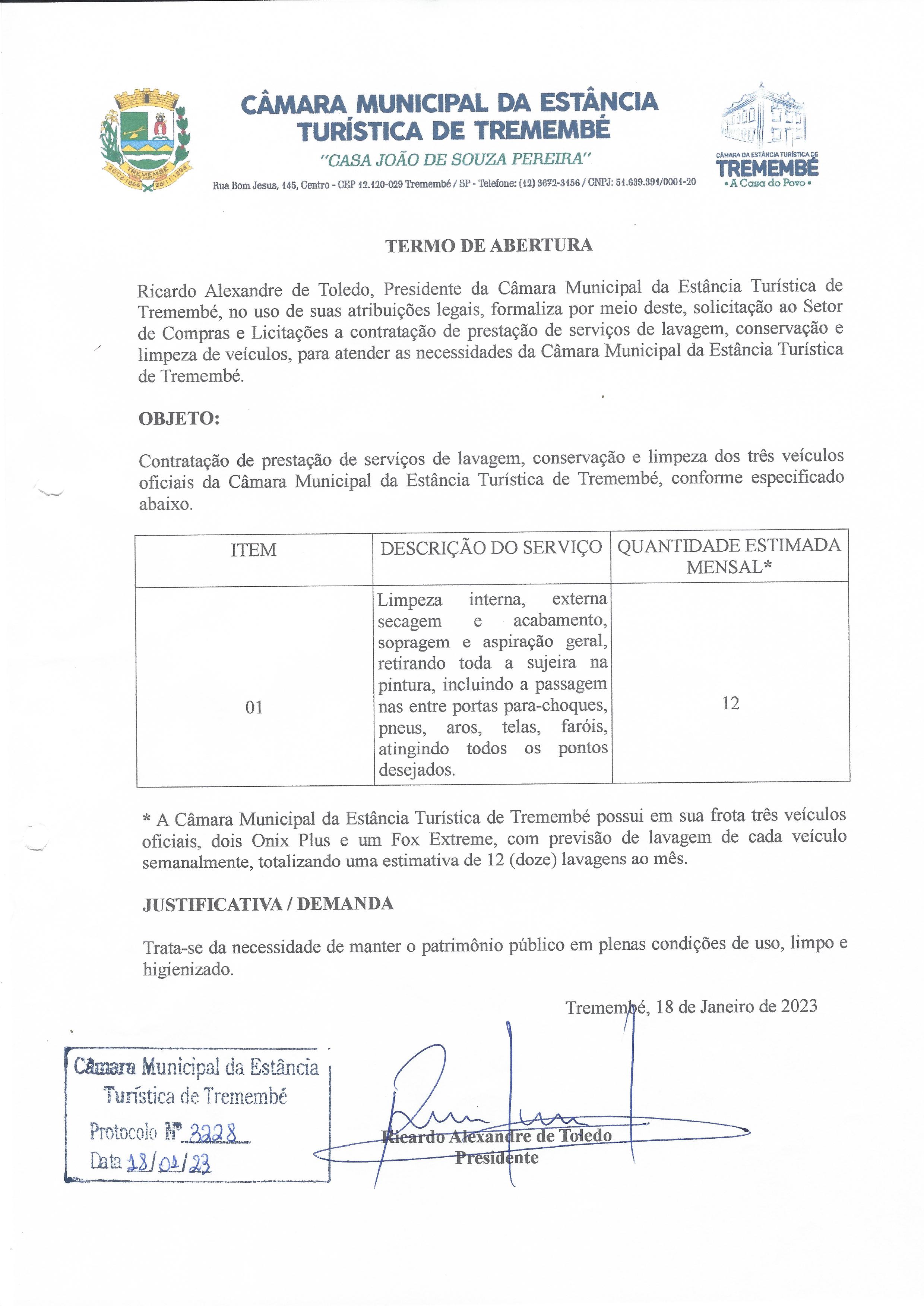 Contratação de empresa para prestação de serviços de lavagem, conservação e limpeza dos três veículos oficiais da Câmara Municipal de Tremembé, conforme especificado.